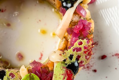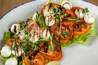 Ein leichter Genuss aus handgeschnittenem Lachs mit fein säuerlichen eingelegten Zwiebeln, erdigen Buchenpilzen und einem Stück Baguette. Ein perfekter mediterraner Starter! (Fisch, Gluten, Ei)