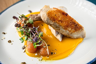 Saftige Hähnchenbrust auf cremigem Kürbispüree mit eingelegten Birnen, Salat (Milch)