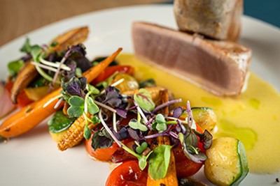 (Medium Rare empfohlen) Perfekt gegrillter Thunfisch auf Zitronen-Butter-Sauce & herzhaften Mischung aus frischem Saisongemüse. (Fisch, Milch)