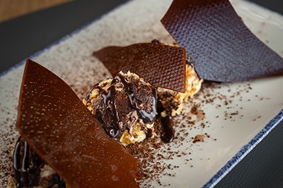 Schokoladiger Brownie mit Kürbiskernen, serviert mit weißer Schokoladensauce (Milch, Gluten, Haselnuss)