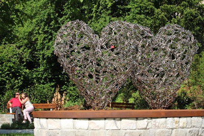 nthüllten die Oberösterreichischen Nachrichten zwei Kettenherzen im ehemaligen Stadtgraben.Die Fertigung erfolgte durch die Firma Schuhmann GmbH. Viele Meter Edelstahl-Kette verschweißt zu einer Herz-Skulptur auf einer rostenden Stahlplatte, zu sehen in einem Park in Steyr.